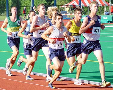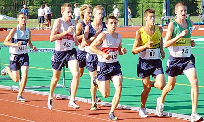 | Approaching 1600 meters ... Hakon DeVries (John Jay EF HS) leads Mike Foley (Saratoga HS), Mark Alizzi (Syosset HS), Jesse Mang (Orchard Park), Robert Hoffman (Mepham HS), Mark Russell (Lockport) and Jeff Belge (Central Square HS) | |