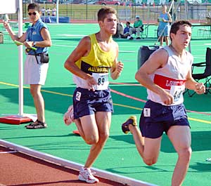 | Approaching 3200 meters ... Jesse Mang (Orchard Park) has the lead with Mark Alizzi (Syosset HS) and Mike Foley (Saratoga HS) in 2nd and 3rd ... Jeff Belge (Central Square HS) is in 6th position - Jeff ran a very good race to finish fourth. | Bell lap ... Mark Alizzi (Syosset HS) and Mike Foley (Saratoga HS) have opened a gap on the field ... both runners finished strongly in an impressive effort. |