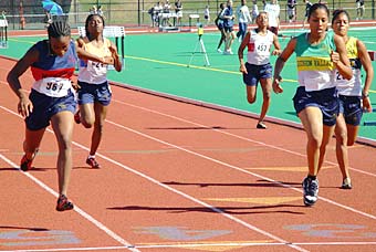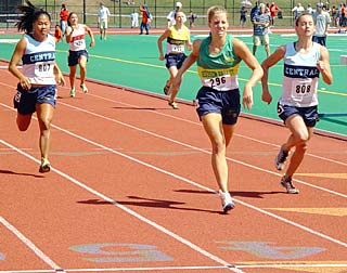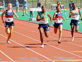 | At the finish ... Adanna Andrews (Yonkers, inside, lane 1) edges Michelle Jones (Burnt Hills HS) with Melissa Usack (Lansing HS) third and Laura McCloskey (John Jay EF HS) fourth. |