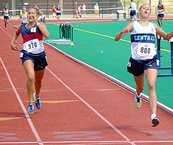 | Approaching 400 meters ... Julie Carr (Columbia HS) leads Triva Alleyne (Brooklyn), Jessica O'Neill (Marcellus HS), Amanda Wheat (Monroe-Woodbury HS) and Karen Kozub (Alden HS) | At the finish ... Jessica O'Neill (Marcellus HS, lane 1) holds on gamely to win over Karen Kozub (Alden HS) ... earlier in the day, Karen finished 6th in the 5000 meter race. |