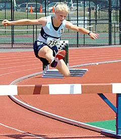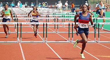 | Ronnetta Alexander (Williamsville) easily winning the hurdle final ... Fetima Fields (CNS), partially hidden behind Ronnetta, finished second to win the silver medal. |