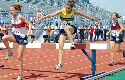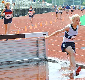 | Two and a half laps complete ... winner Tracey Brauksieck (Homer HS graduate in 2002) leads Karen Elliott and Kelli O'Brien of the Western Region | Tracey Brauksieck clears the next-to-last barrier in her excellent winning effort ... Tracey's hurdle form and water-barrier form was actually quite good (she did not run the steeplechase during high school). |