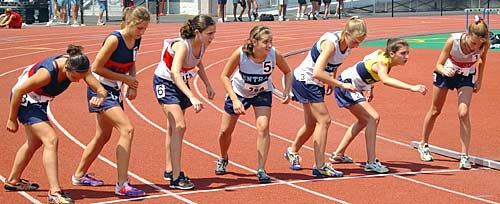 | At the start ... from right to left are Lindsay Sundell (Northport HS), Emily Malinowski (Bethlehem HS), Kayleigh Wheeless (Westhill HS), Emily Bome (Onondaga Central HS), Beth Alizzi (Syosset HS), Erika Somogyi (Orchard Park) and Bambi Williams (Springwater) | |