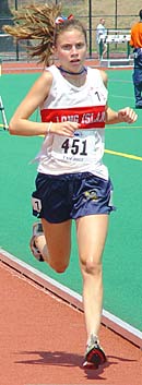 | Approaching three laps completed ... winner Lindsay Sundell (Northport HS) leads Emily Malinowski (Bethlehem HS) and Erika Somogyi (Orchard Park). | At the finish ... Lindsay Sundell (Northport HS) wins handily with an excellent time of 7:20.81 under the hot and humid conditions ... Based on times by other runners, Lindsay appears to be a sub-7:00 steeplechaser ... Lindsay has already run 10:01 for a 3000m race - therefore, the NYS high school steeplechase record (6:55.9) is in jeopardy next year ... Lindsay's running form is outstanding, and I believe she will emerge as a top elite runner during XC and track this coming year. |