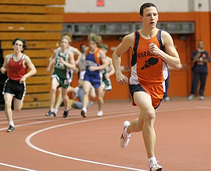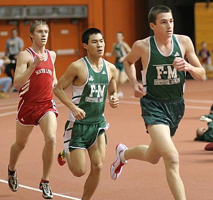 | 1600 Meter Run ... early in the race ... winner Owen Kimple (FM, 4:26.77) led the entire race ... Ben Adams (Central Sq, 4:29.32, far left) was second and John Heron (FM, 4:29.99) was third. |