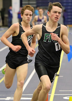 | Girls 3000 Meter Run ... Early in the race ... winner Brooke Rauber (Tully, 9:46.83) leads Sophie Ryan (FM), Claire Walter (FM) and Eva Borton (Clinton) ... Rauber split 4:48 (foe 1500m) and 5:08 (for 1600m) during the race. | ||||