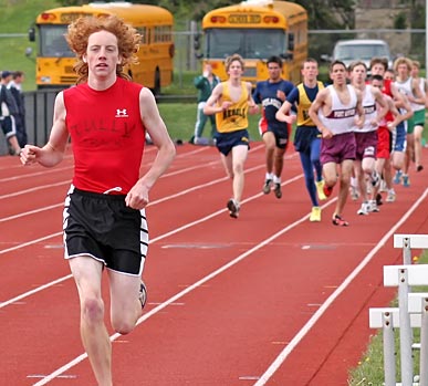 | 3200 Meter Run ... early in the race (race was combined National & American Divisions) ... Tully sophomore Scott Vandermolen (10:13) led from start to finish and won easily (his season's best is 9:58.6) ... Scott ran the opening 1600 meters in 5:05 ... his final 400 meters was 70 seconds. |