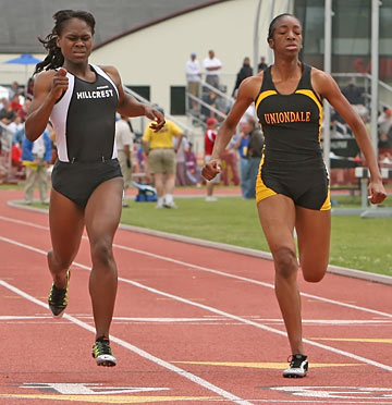 400 Meters (Div 12) ... Makalia Griffith (Hillcrest, left) comes on to edge Ashlea McLaughlin (Uniondale)