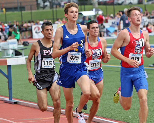 Boys 3000 Meter Steeplechase ... Seeded Heat ... approaching one lap to go ... Parker Stokes (Maine-Endwell, #425) and Liam Higgins (Goshen) lead Carlos Santos (Patchogue-Med) and Louis Greco (Goshen) ... Parker Stokes burst to an open margin on the final lap to win handily (he is a top returning cross country runner this coming fall).